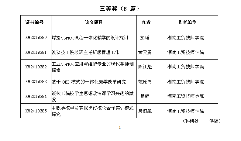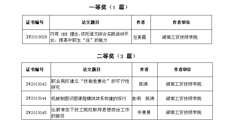 在2019年湖南省职业教育与成人教育优秀论文评比中,我院共有10篇参评论文获奖,其中一等奖1名,二等奖3名,三等奖6名。具体获奖名单如下: