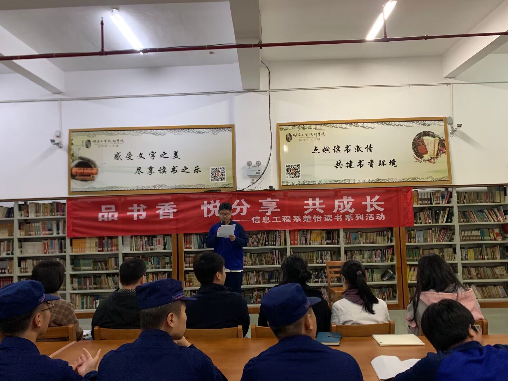 为落实心博官方网站_XINBO(中国)楚怡读书行动号召,在第28个世界读书日到来之际,信息工程系在心博官方网站_XINBO(中国)图书馆隆重举行了“品书香,悦分享,共成长”读书分享活动。本次活动邀请了系主任李会明参加,由团总支学生干部龙远鹏主持。