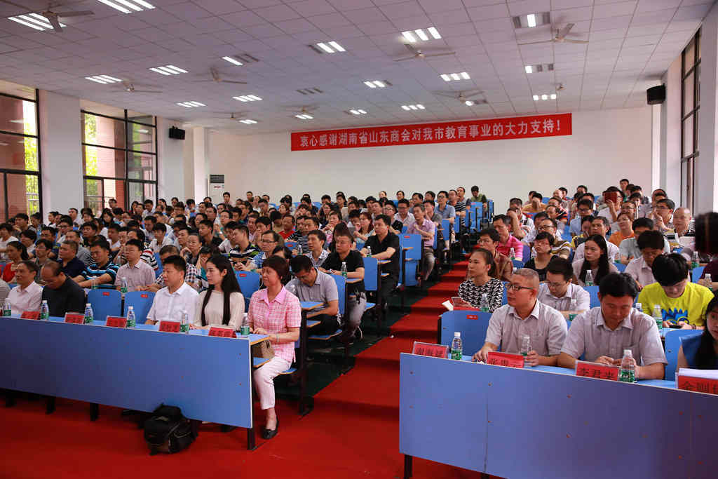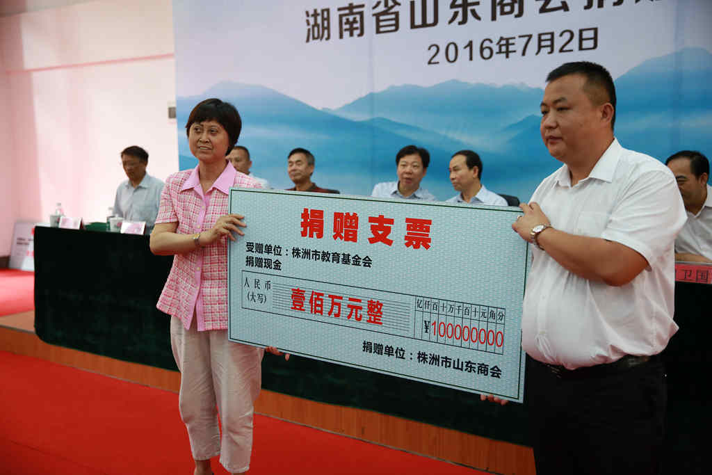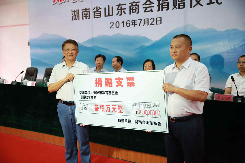 仪式上,湖南省山东商会会长李涛介绍了湖南省山东商会的发展历史和办会宗旨,以及为加强山东与湖南两地经贸投资与交流,为推动山东与湖南经济发展所作的贡献,并向我市捐赠300万元教学设备。株洲市山东商会会长代义峰向我市捐赠100万元助学金。