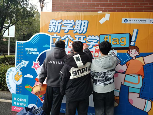 团委还同步开展了“新学期,立个开学flag”活动,在校门口、食堂和宿舍楼下设立三处打卡点,鼓励同学写下新学期的愿望和目标,校园广播站也在实时播放同学们的心愿。