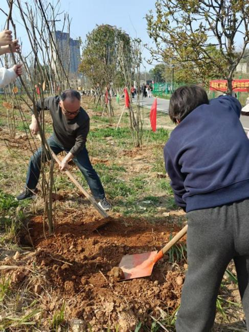 航空工程系党支部书记、主任罗运才以及党员教师们带头挥锹铲土,团员青年协同培苗浇水,党旗与团旗在春风中交相辉映,一株株新苗扎根沃土,为天池公园东区生态园增添了一片绿色。