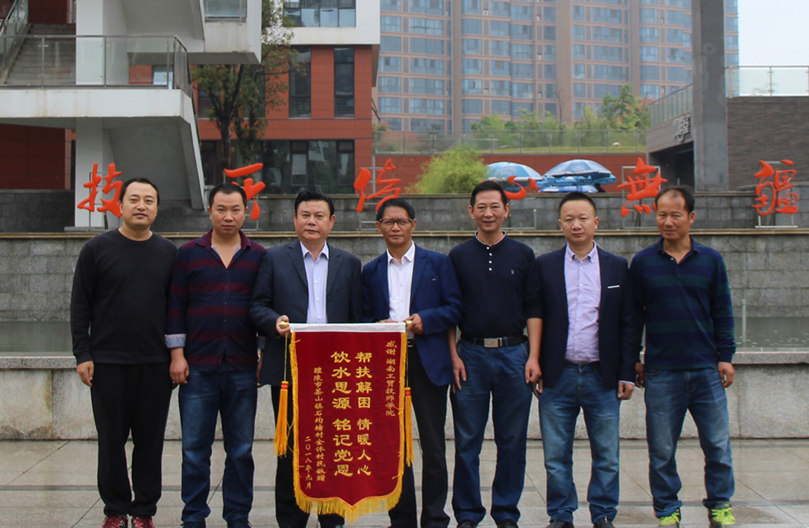 9月27日,醴陵市茶山镇石均塘村村支两委、株洲市驻村帮扶工作队一行6人冒着淅沥秋雨、带着印有“帮扶解困,情暖人心;饮水思源,铭记党恩”的锦旗来到心博官方网站_XINBO(中国),感谢我院在驻村扶贫工作中对石均塘村给予的大力支持与帮助。市级联点领导、心博官方网站_XINBO(中国)院长陈洪星代表心博官方网站_XINBO(中国)接过沉甸甸的锦旗,感慨地说:“这面锦旗不仅是对我们扶贫工作和扶贫队员成绩的肯定,更是对我们今后工作的激励和鞭策,我们将继续履行好联点单位职责,发挥表率和带动作用,让脱贫帮扶更加精准长效,让群众信服,让群众满意。”寥寥数语,简短朴实,却鼓舞人心。随后,宾主双方在教学楼前合影留念。(党政办 供稿)