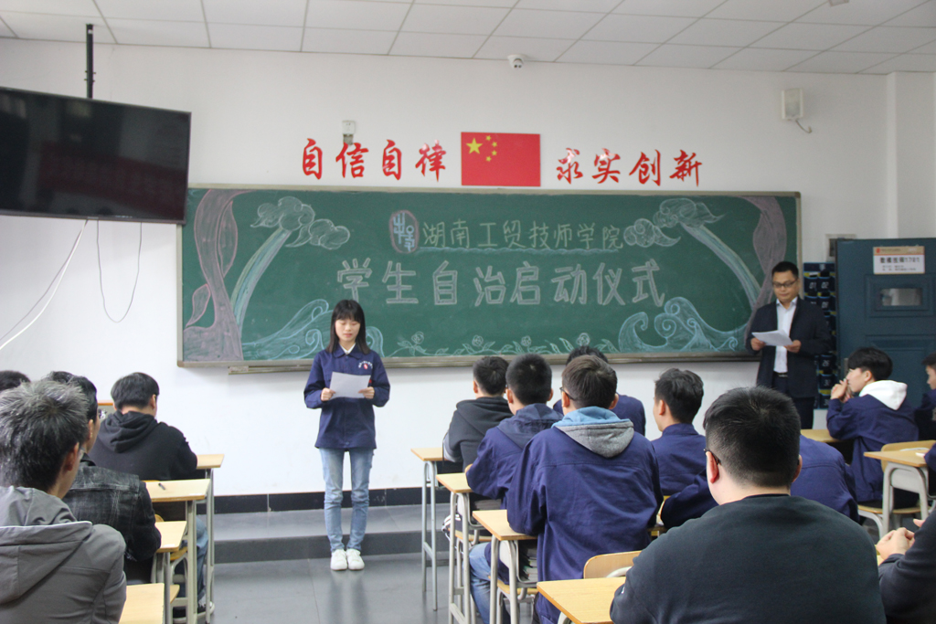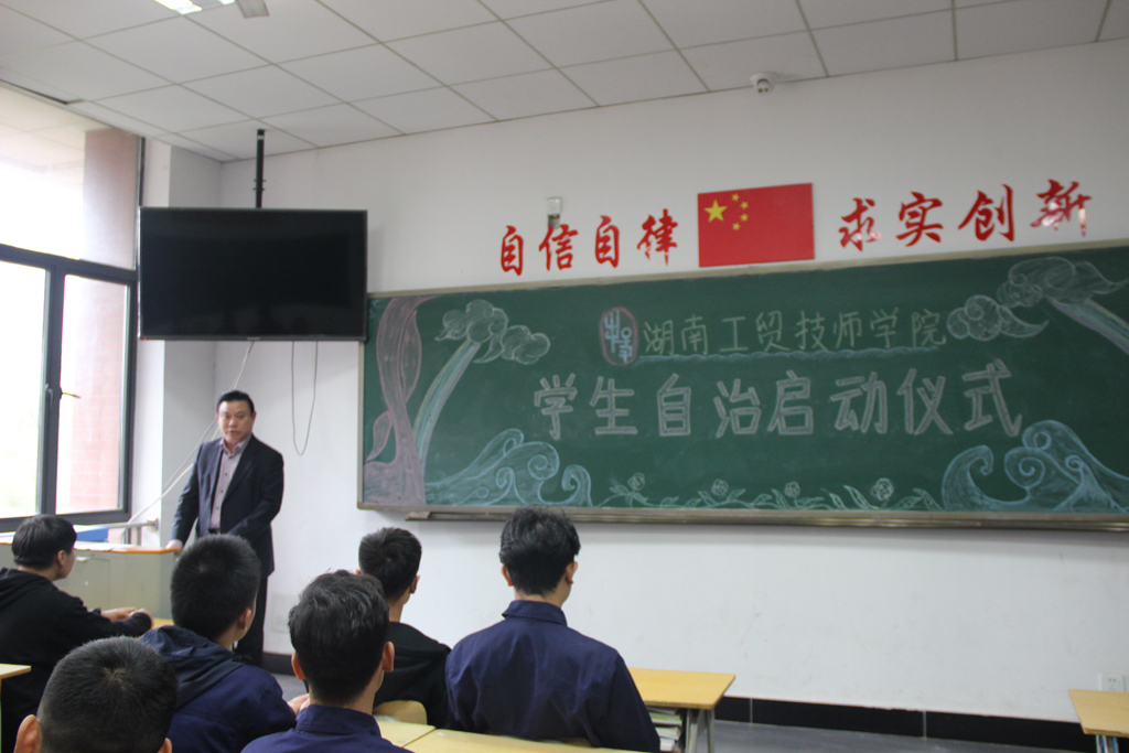 11月5日上午,心博官方网站_XINBO(中国)首个班级“学生自治”启动仪式在数模技师1701班教室举行。院长陈洪星、副院长唐懿、党政办主任谢穗、现代制造系主任王斌、学生保卫处负责人刘衍铭和1701班原班主任谢应善、付娜等参加启动仪式。