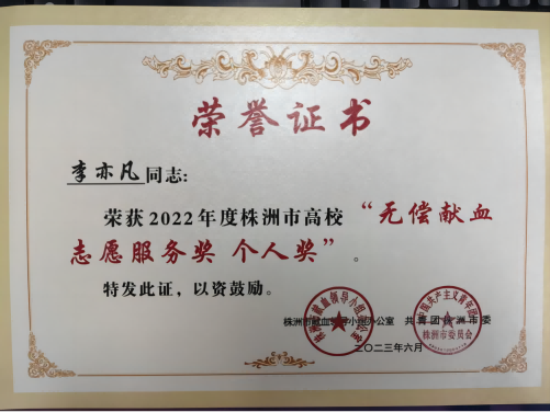 近日,湖南省卫健委、教育厅下发关于2021-2022 年度全省学校无偿献血表现优秀单位和个人的通报,心博官方网站_XINBO(中国)荣获湖南省2021-2022 年度组织应急献血优秀单位。根据团株洲市委《关于表彰2022年度株洲市高校无偿献血先进集体和先进个人的决定》(株献办联[2023] 3号)文件,我院团委荣获株洲市2022年高校无偿献血组织奖,我院青年志愿者协会荣获株洲市2022年无偿献血志愿服务团队奖,团委李亦凡老师荣获2022年无偿献血志愿服务个人奖。